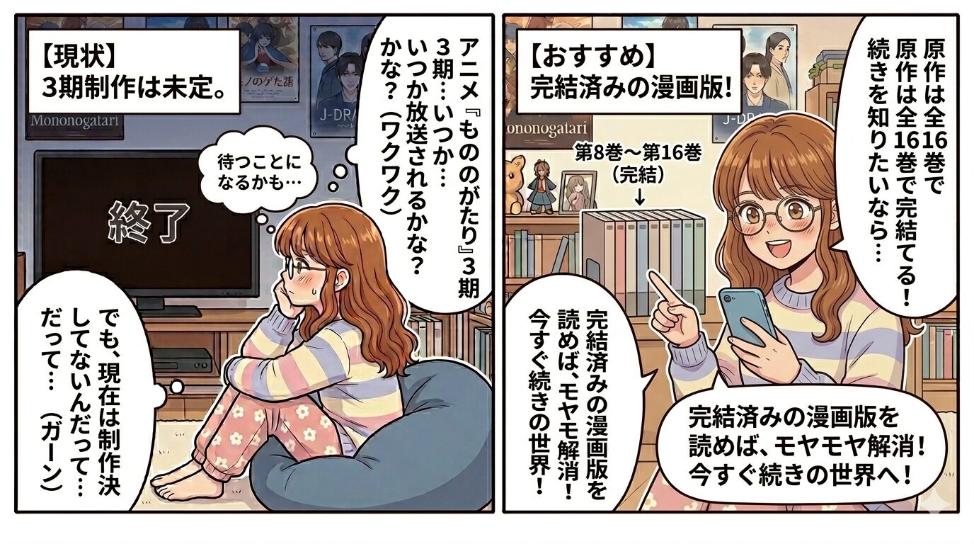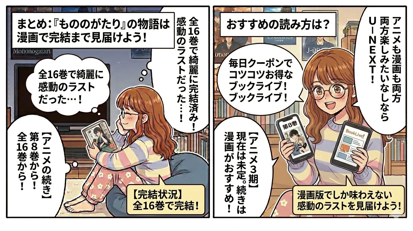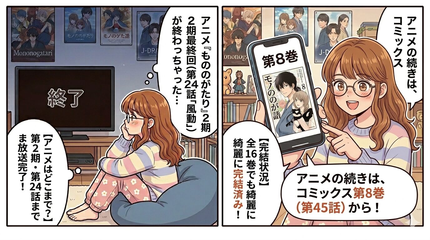 結論から言うと、アニメ『もののがたり』の続きは漫画の「8巻(第45話)」から読むことができます!