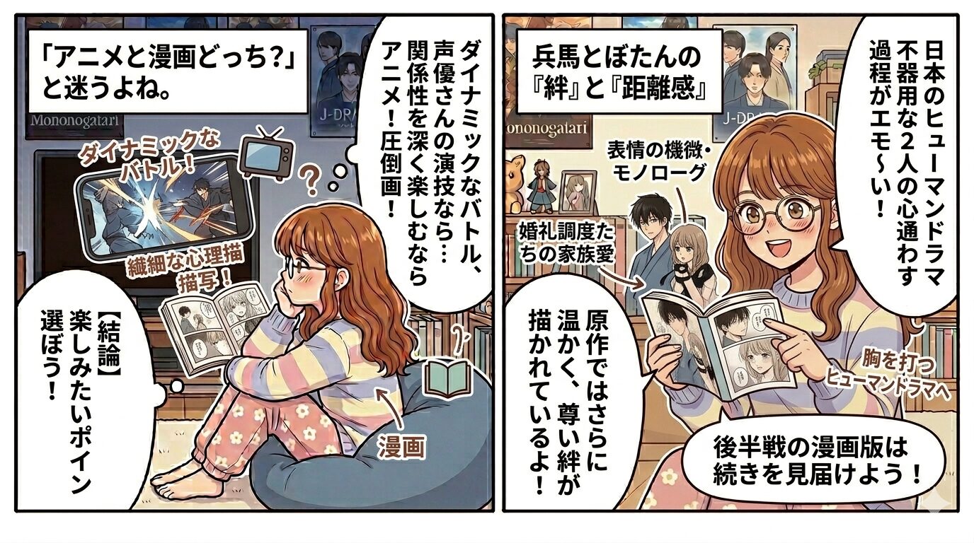 結論から言うと、バトルシーンのダイナミックな動きや声優さんの熱演を楽しみたいならアニメ、人間ドラマや繊細な心理描写、キャラクター同士の関係性を深く楽しみたいなら圧倒的に「漫画」をおすすめします。