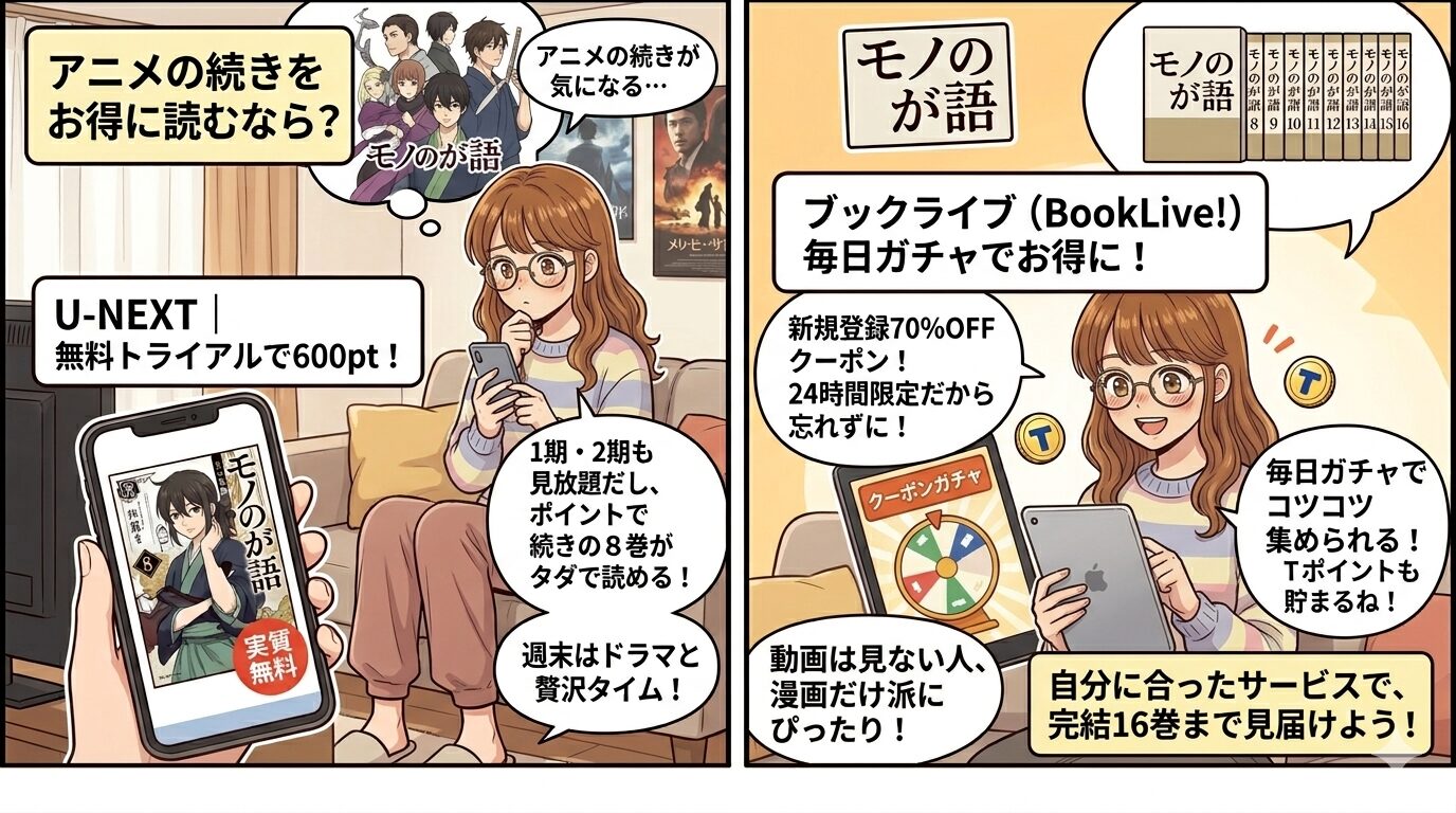 - 女性に嬉しいポイント: アニメ『もののがたり』の1期・2期がすべて見放題。さらに、もらったポイントを使えば、アニメの続きである8巻を1冊まるごと実質無料で読み始めることができます。