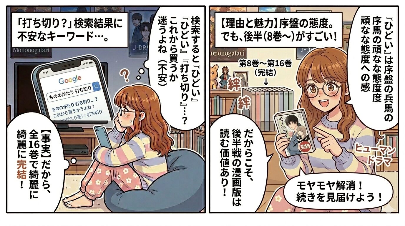 『もののがたり』と検索すると、「ひどい」「打ち切り」といった少し不安になるキーワードが出てくることがあります。これから漫画を買おうか迷っている方は驚いてしまいますよね。
